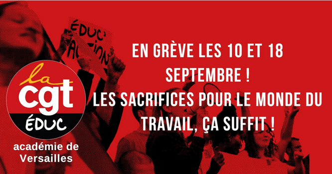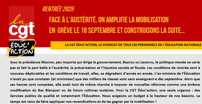 La CGT Éduc’action appelle donc l’ensemble des personnels à être en grève le 10 septembre et à se réunir pour discuter des suites et de l’ancrage de la mobilisation, notamment le 18 septembre journée de grève intersyndicale et interprofessionnelle.