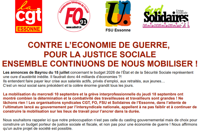 C’est donc une mobilisation d’ampleur, inscrite dans la durée qu’il faut construire pour faire reculer le budget austéritaire et imposer une politique au service des salarié∙es, des services publics, de la sécurité sociale et de la paix.
